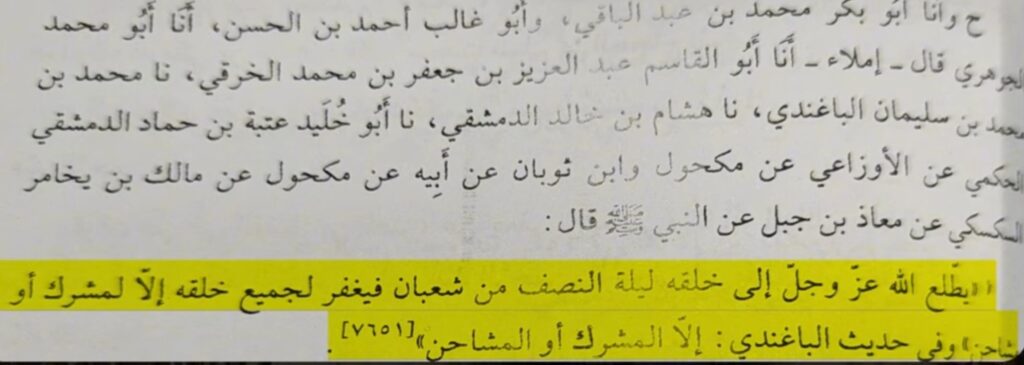حَدَّثَنَا رَاشِدُ بْنُ سَعِيدِ بْنِ رَاشِدٍ الرَّمْلِيُّ، حَدَّثَنَا الْوَلِيدُ، عَنْ ابْنِ لَهِيعَةَ، عَنْ الضَّحَّاكِ بْنِ أَيْمَنَ، عَنْ الضَّحَّاكِ بْنِ عَبْدِ الرَّحْمَنِ بْنِ عَرْزَبٍ، عَنْ أَبِي مُوسَى الْأَشْعَرِيِّ، عَنْ رَسُولِ اللَّهِ صَلَّى اللَّهُ عَلَيْهِ وَسَلَّمَ قَالَ: إِنَّ اللَّهَ لَيَطَّلِعُ فِي لَيْلَةِ النِّصْفِ مِنْ شَعْبَانَ، فَيَغْفِرُ لِجَمِيعِ خَلْقِهِ إِلَّا لِمُشْرِكٍ أَوْ مُشَاحِنٍ